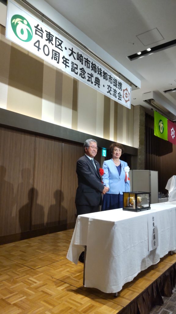 記念式典では台東区長、大崎市長からご挨拶があり、来賓の祝辞として髙森台東区議長、後藤大崎市議長、大崎市選出の国会議員である小野寺元防衛大臣、台東区選出の辻外務副大臣から祝辞がありました。