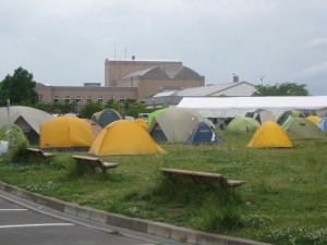 東松島市コミニティセンター内、ボランティアのテントがぎっしりと。